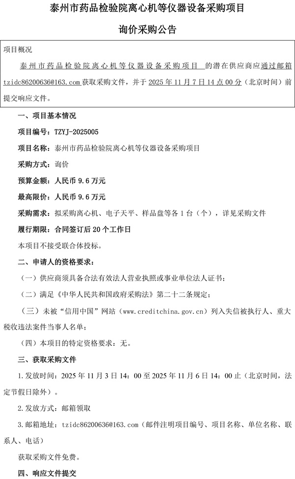 泰州市药品检验院离心机等仪器设备采购项目询价采购公告