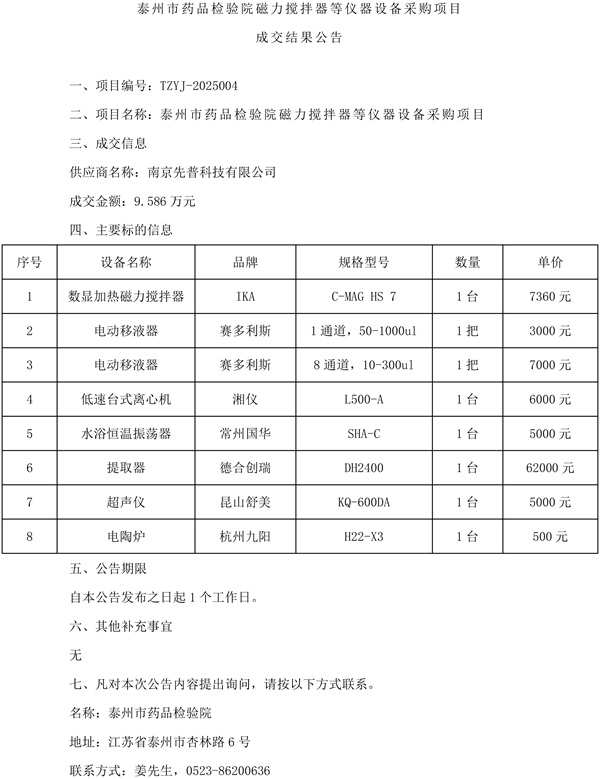 泰州市药品检验院磁力搅拌器等仪器设备采购项目成交结果公告