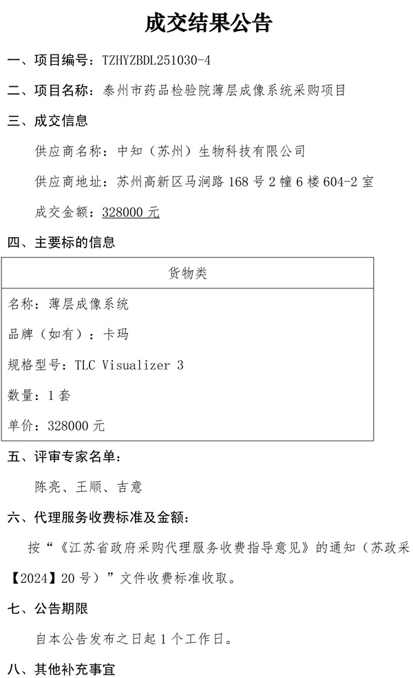 泰州市药品检验院薄层成像系统采购项目成交结果公告