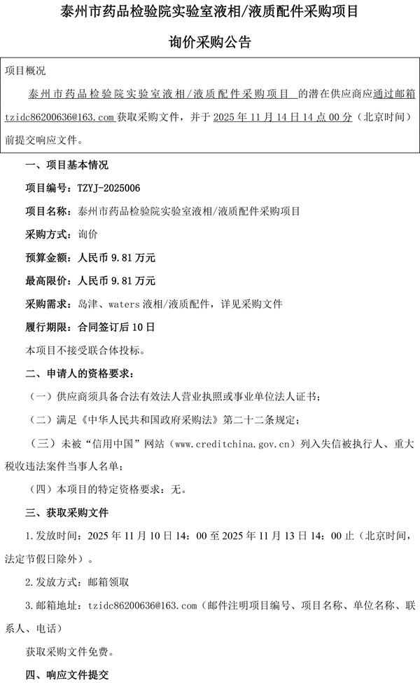 泰州市药品检验院实验室液相液质配件采购项目询价采购公告.pdf