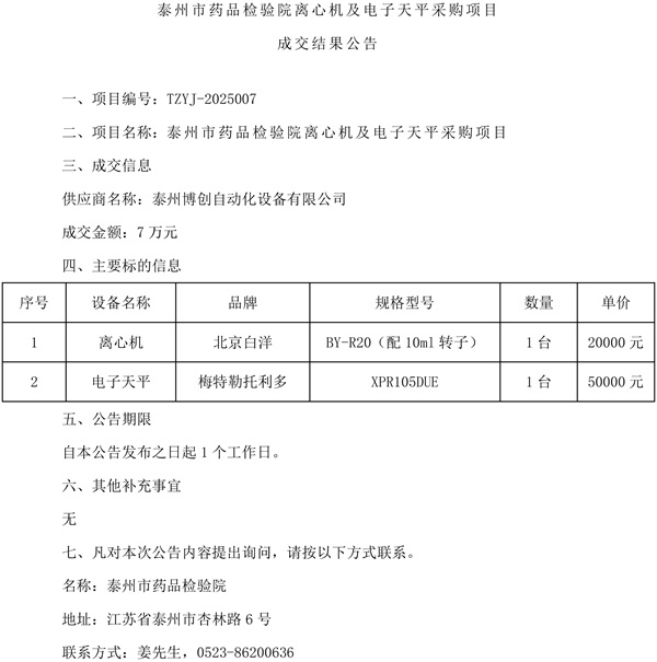 泰州市药品检验院离心机及电子天平采购项目成交结果公告