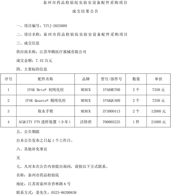 泰州市药品检验院实验室设备配件采购项目成交结果公告