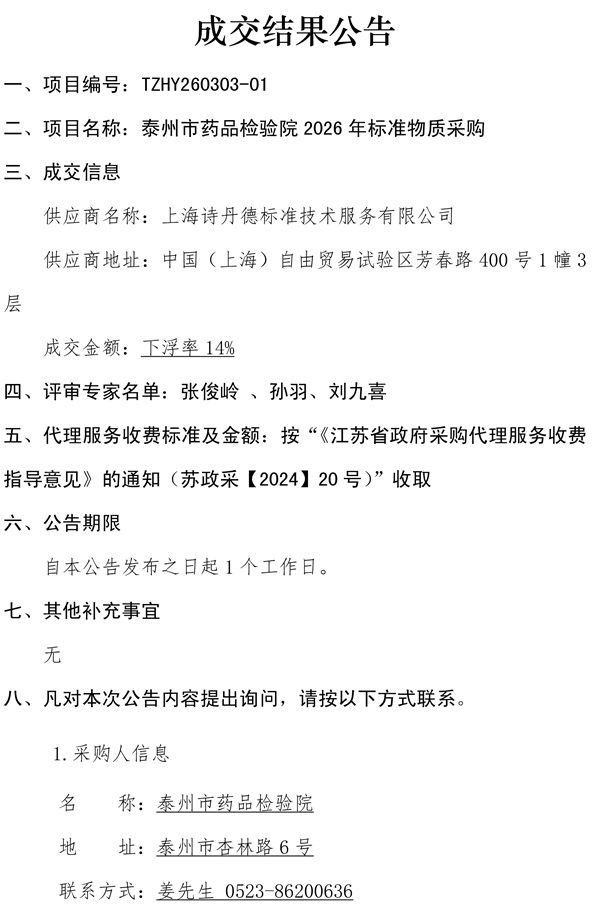 泰州市药品检验院2026年标准物质采购成交结果公告