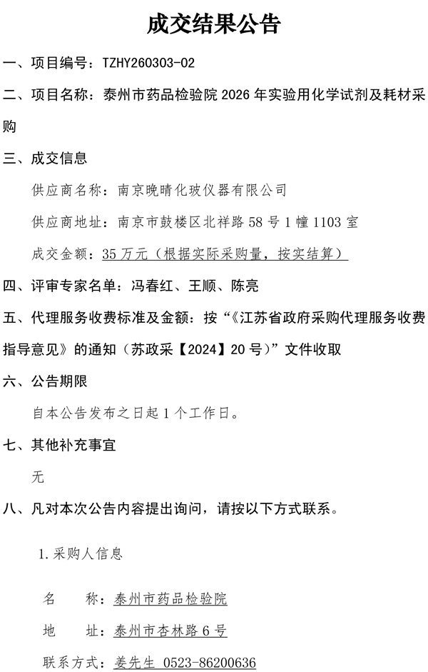 泰州市药品检验院2026年实验用化学试剂及耗材采购成交结果公告
