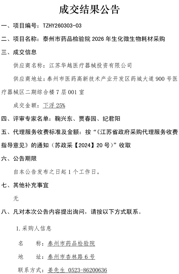 泰州市药品检验院2026年生化微生物耗材采购成交结果公告.pdf
